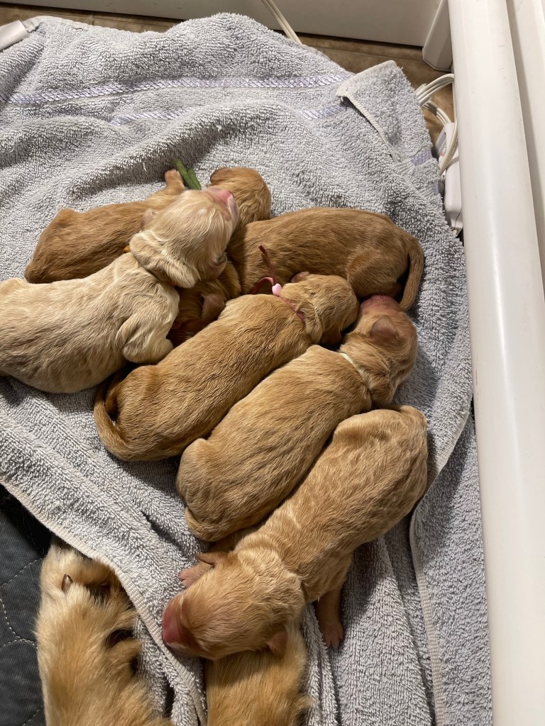 1/2 are having a snooze on the warming mat and 1/2 are nursing. Trying to help Poppy out with this large brood!